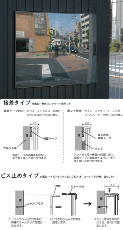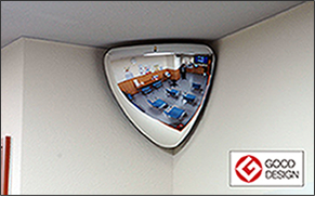 車の出入りの多い校門等の死角の確認に! ※FFミラーは駐車場・車庫の出口用ミラーとして作られています。動きながら、または遠くから見る場合、像が歪んで見える場合があります。また特殊構造のため、凸面鏡より解像度が落ちます。視認性には問題がありません。屋外に設置可能 |